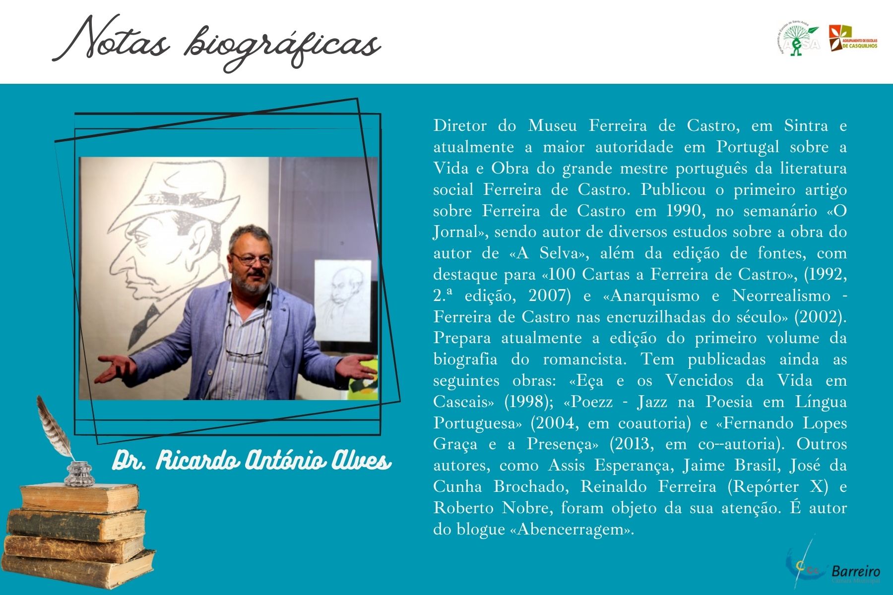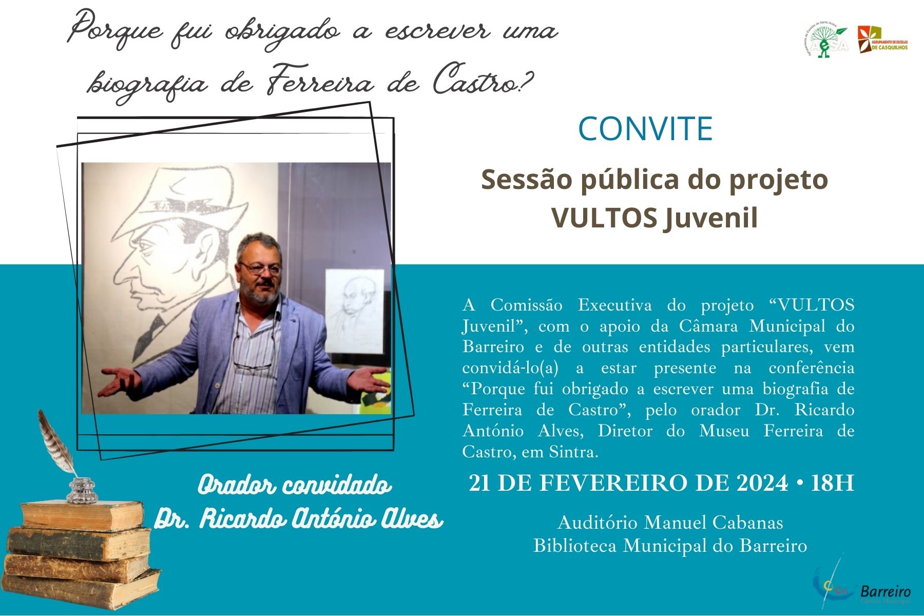 Após a Sessão Oficial de Abertura do projeto VULTOS Juvenil, em outubro do ano transato, que contou com o orador Dr. José Pacheco Pereira, realizar-se-á no próximo dia 21 de fevereiro de 2024, pelas 18h00, no Auditório Manuel Cabanas, anexo à Biblioteca Municipal do Barreiro, uma Conferência que terá como orador convidado o Dr. Ricardo António Alves. O tema desta conferência será “Porque fui obrigado a escrever uma biografia de Ferreira de Castro“.