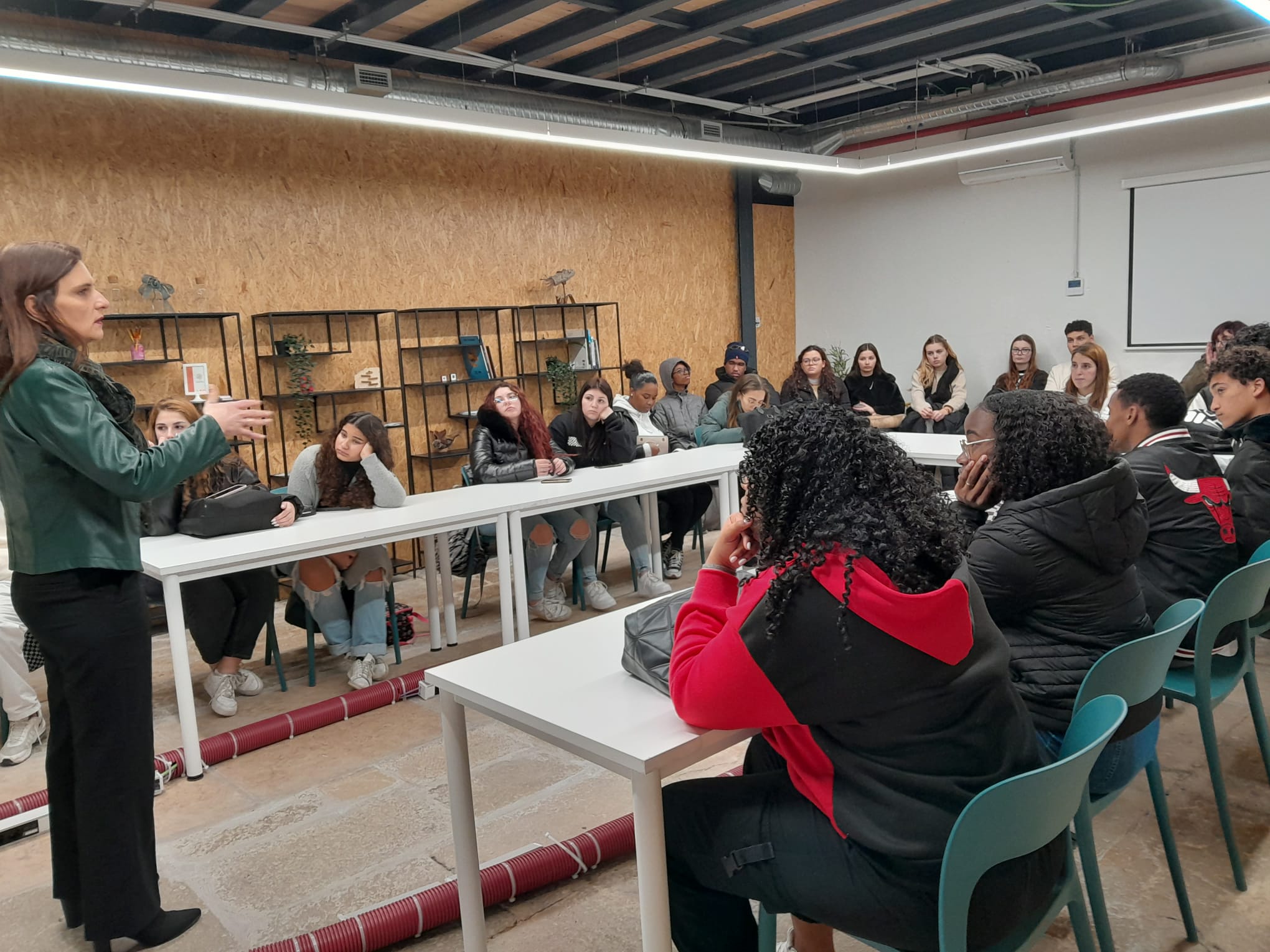 A atividade começou com a receção aos nossos/as alunos/as no Welcome Lounge Alburrica pela Drª Nádia Leitão, Coordenadora da StartUpUp Barreiro que fez uma visita guiada a todos os espaços: Rio Coina e Moinhos de Vento Cowork, Moinho Poente – gabinetes de trabalho, Sul e Sueste Lounge e Mulete do Tejo Creative Corner, que também dinamizou a sessão sobre estágios Profissionais no Meeting Room Rio Tejo.