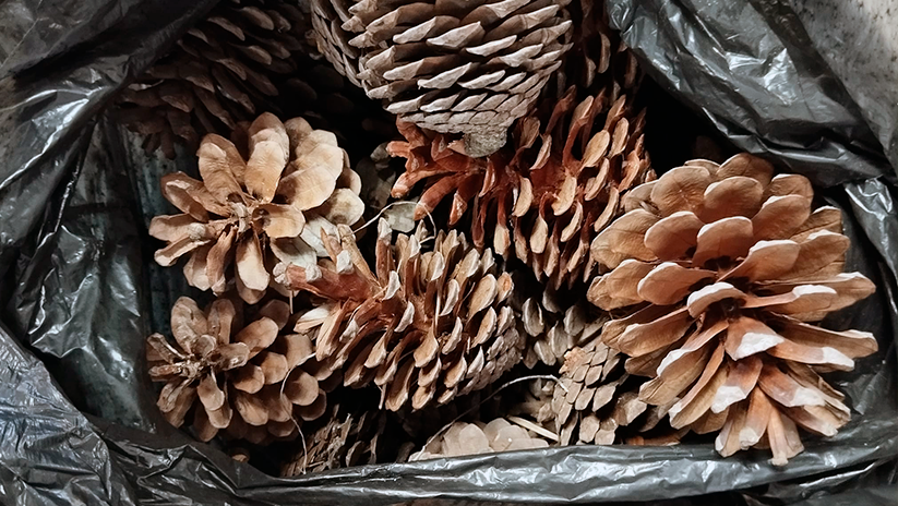 Neste ano letivo, já iniciámos várias ações: apanhámos resíduos, combatemos espécies invasoras e recolhemos material vegetal resultante de podas e muitas pinhas, recurso este que se pode levar para casa, para usar em lareiras, em decorações ou outros fins criativos.