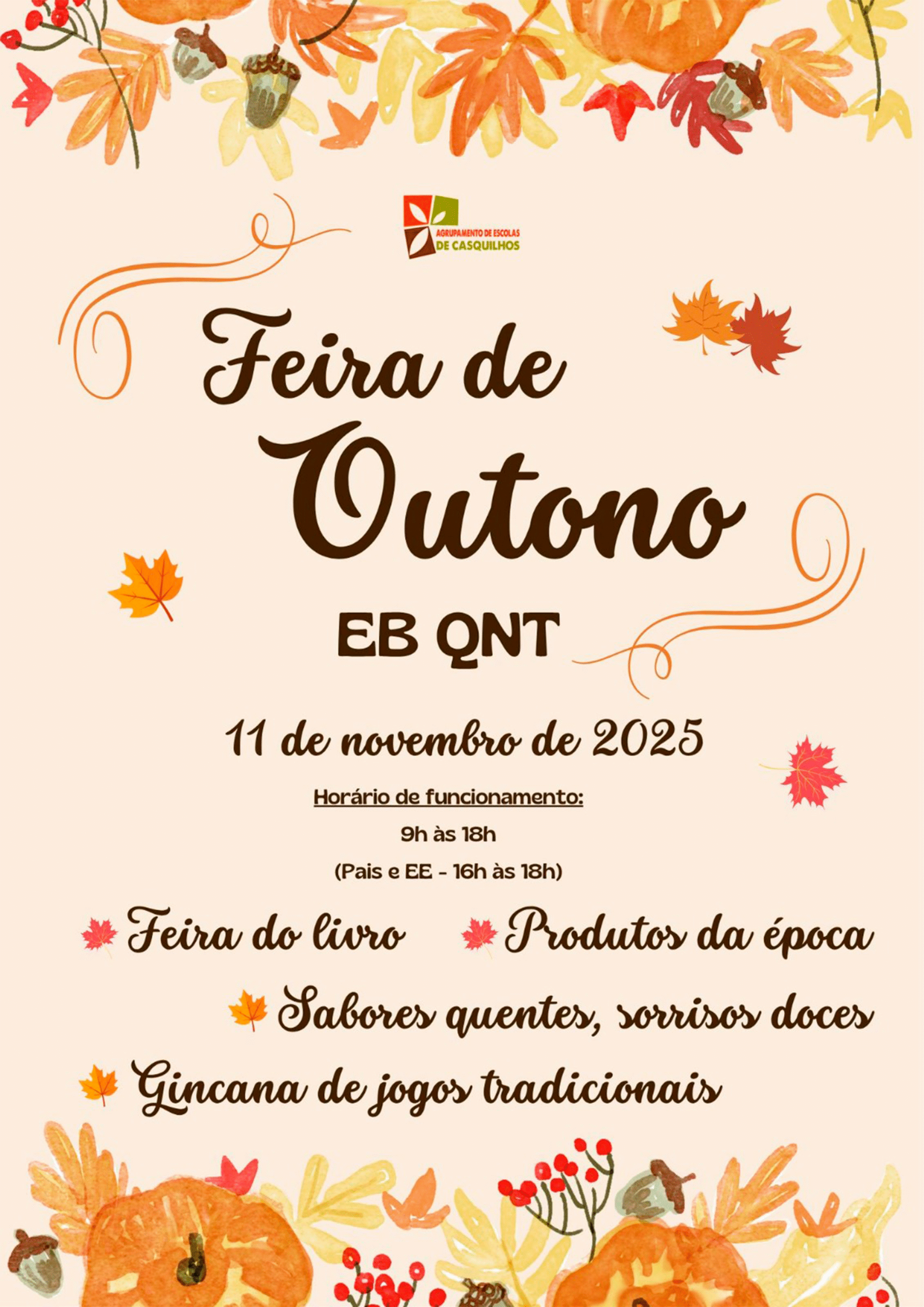 No próximo dia 11 de novembro, a Escola Básica Quinta Nova da Telha vai realizar, pela primeira vez, a Feira de Outono, no largo junto à portaria. O evento terá várias bancas com livros, produtos da época, castanhas assadas, doces variados e muitas outras iguarias de outono. Durante a manhã, entre as 9h20 e as 12h20, os alunos do 1.º e 2.º ciclos participarão numa gincana de jogos tradicionais, promovendo momentos de convívio e colaboração. Horário da Feira: – 9h00 às 16h00 – alunos, pessoal docente e não docente; – 16h00 às 18h00 – pais e encarregados de educação. Contamos com a vossa presença para dar vida à nossa primeira Feira de Outono e celebrar juntos os sabores e tradições desta estação!