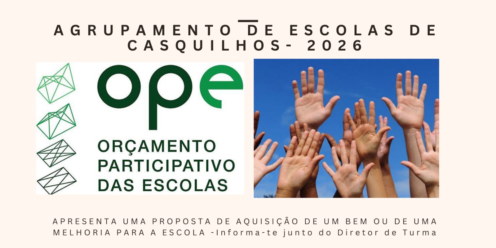 O OPE está de volta! Os alunos do 3.º Ciclo do Ensino Básico e do Ensino Secundário vão poder decidir o que querem melhorar na sua escola. Para isso, precisam de ter uma ideia, reunir apoio e, claro, conseguir os votos dos colegas! Trata-se de um processo democrático que acontece na Escola Básica Quinta Nova da Telha e na Escola Secundária de Casquilhos. A apresentação de propostas, na Secretaria da Escola Secundária, pode ser feita até 2 de março. Apelamos à consulta do Regulamento e à participação dos alunos!
